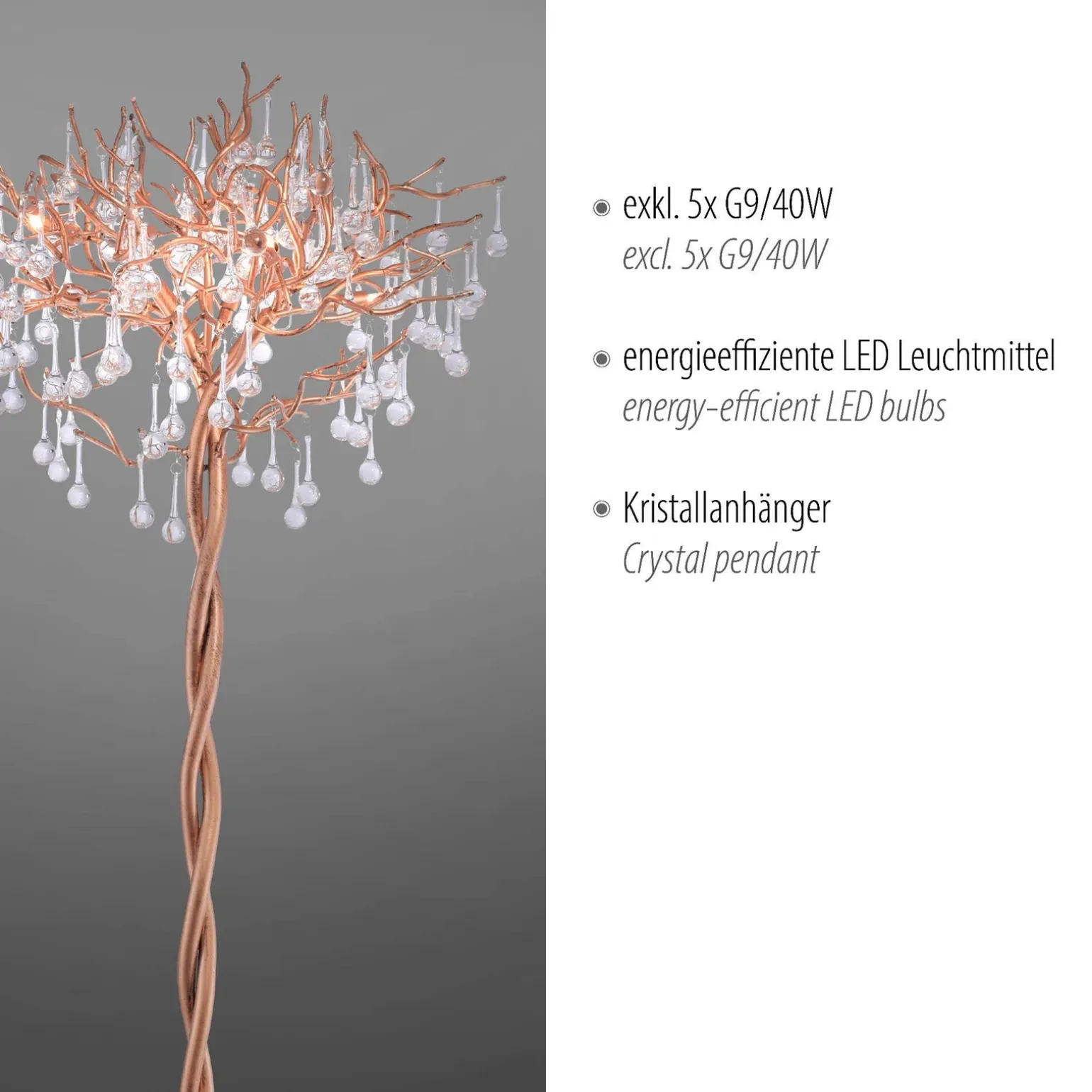 Model ICICLE posiada pięć źródeł światła, co pozwala na uzyskanie odpowiedniego oświetlenia w pomieszczeniu. Maksymalna moc wynosząca 40 W sprawia, że całość jest energooszczędna, nie rezygnując przy tym z wydajności. Dzięki trzonkowi G9, lampa podłogowa zapewnia łatwość wymiany żarówek, co wpływa na jej długowieczność oraz funkcjonalność. Wybierając ten model, można cieszyć się komfortowym i przyjemnym światłem, które z pewnością umili wieczory w salonie lub sypialni.