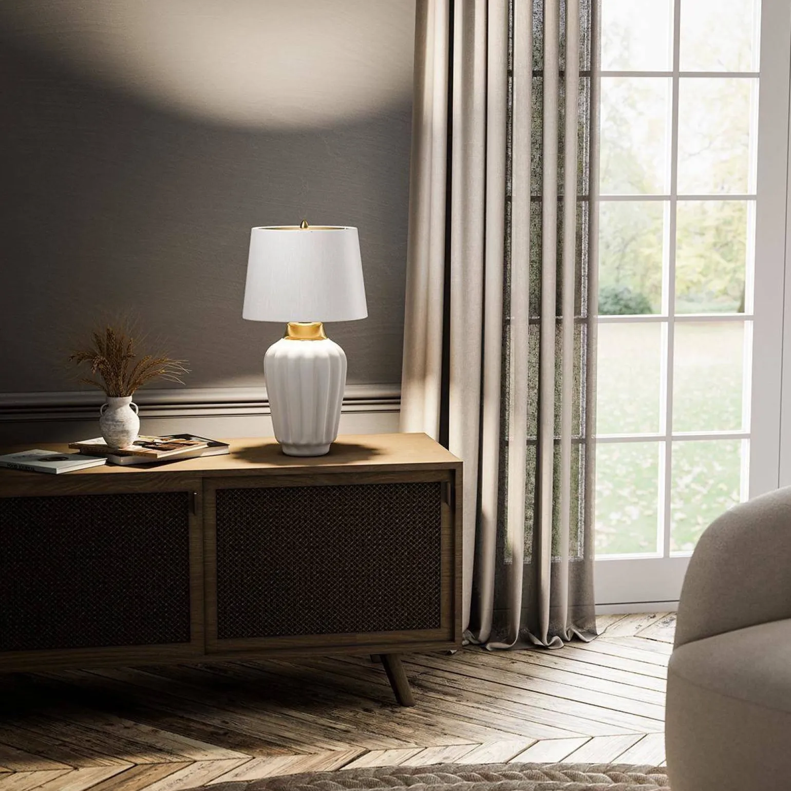 Producent skoncentrował się na detalach. Bexley wyróżnia się białą ceramiką w połączeniu z szczotkowanym mosiądzem, co nadaje jej niepowtarzalnego charakteru. Klasyczny design i kość słoniowa klosza z dodatkiem złotej laminacji sprawiają, że staje się ona wyjątkowym akcentem w każdym pomieszczeniu. Lampa idealnie nadaje się na komodę lub stół, oferując estetyczne i funkcjonalne światło.