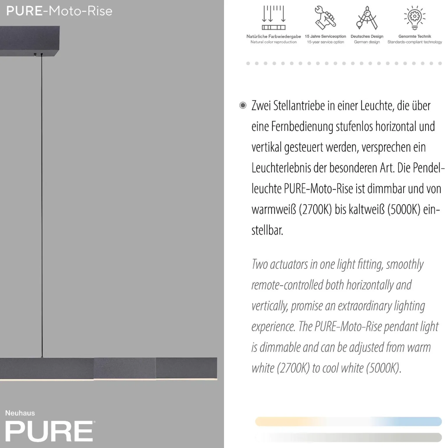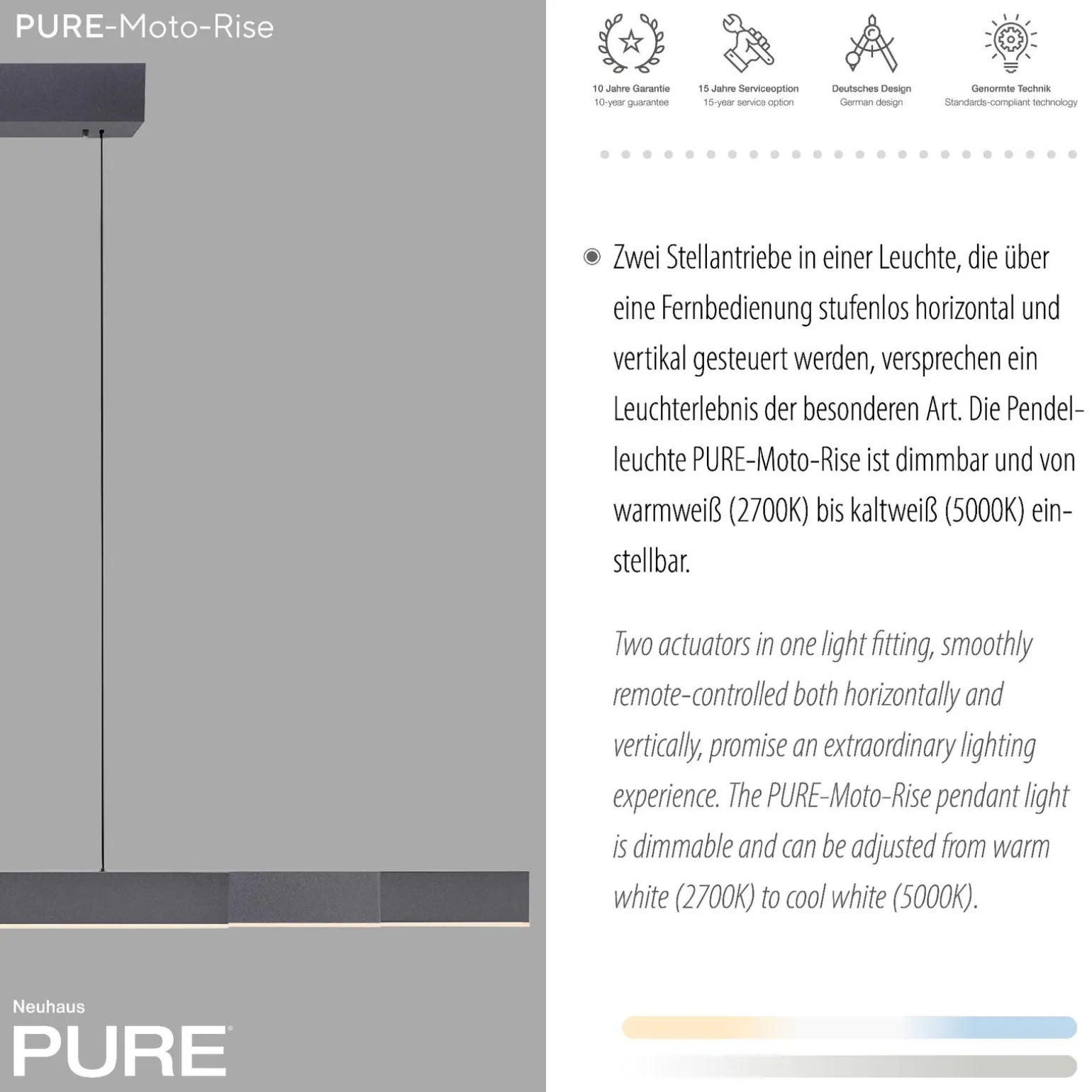 PURE-MOTO-RISE to lampa wisząca, która została zaprojektowana z myślą o funkcjonalności oraz estetyce. Z jej pomocą możesz z łatwością regulować wysokość i szerokość za pomocą pilota, co gwarantuje komfort podczas codziennego użytkowania. Wbudowany system E-Lift umożliwia płynne dostosowanie lampy do Twoich potrzeb, co czyni ją idealnym rozwiązaniem do różnorodnych aranżacji wnętrz.