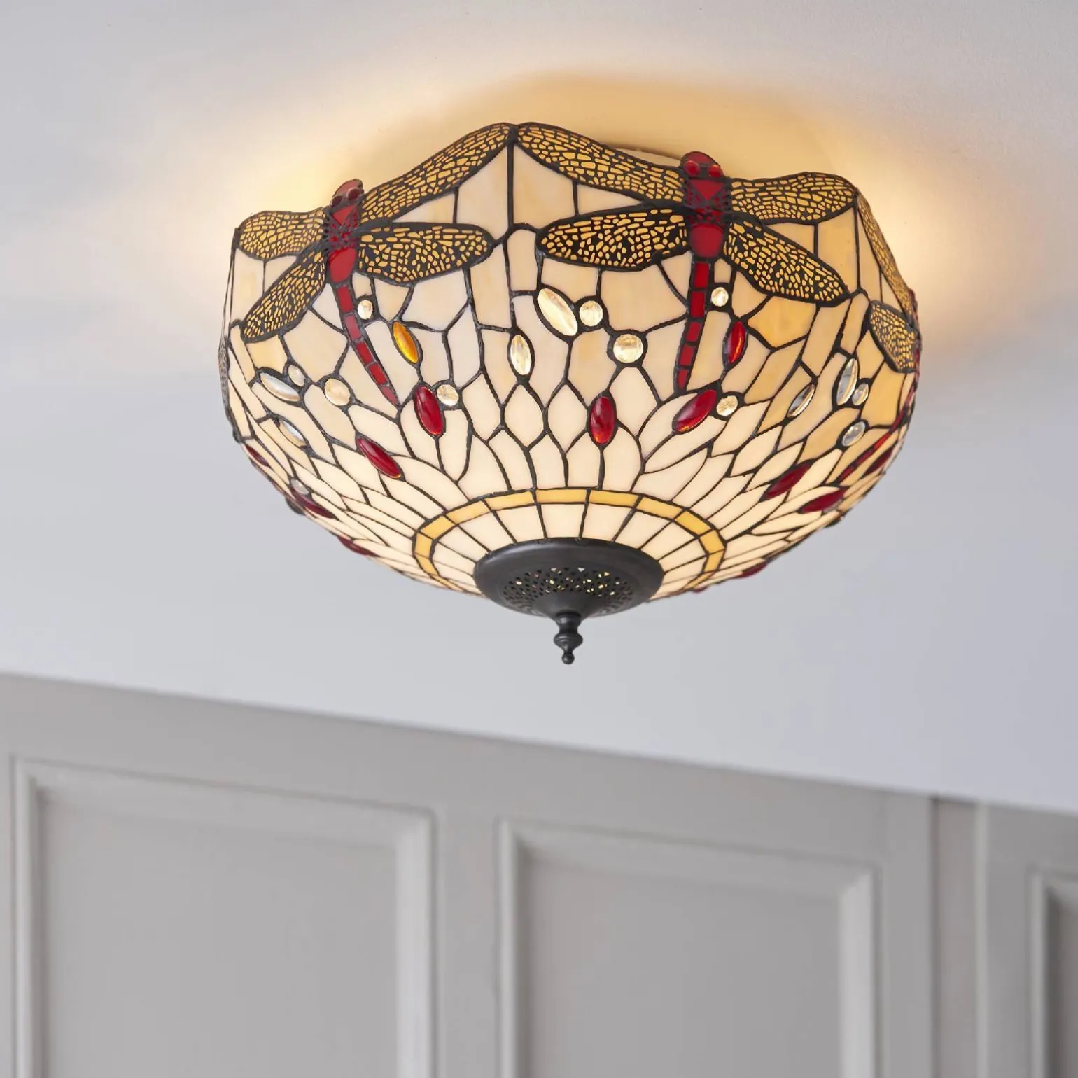 Plafon Dragonfly beige marki Tiffany (kod produktu: 70723) to wyjątkowy element oświetleniowy, który rozświetli każde wnętrze, dodając mu niepowtarzalnego charakteru. Ten plafon wewnętrzny idealnie sprawdzi się w różnych pomieszczeniach, takich jak salon, sypialnia czy jadalnia. Dzięki swojemu eleganckiemu designowi, inspirowanemu stylem Art Deco oraz Retro, stanie się nie tylko źródłem światła, ale również ozdobą każdego wnętrza.