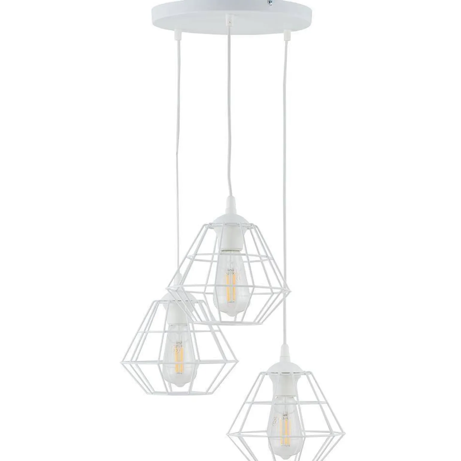 DIAMOND NEW WHITE to lampy wiszące z abażurem, które mają trzy źródła światła. Zastosowanie trzonka E27 umożliwia łatwą wymianę żarówek, co pozwala na dostosowanie mocy oświetlenia do indywidualnych potrzeb. Maksymalna moc 15W dla każdego ze źródeł zapewnia wystarczające oświetlenie pomieszczeń, takich jak salon, jadalnia czy kuchnia.