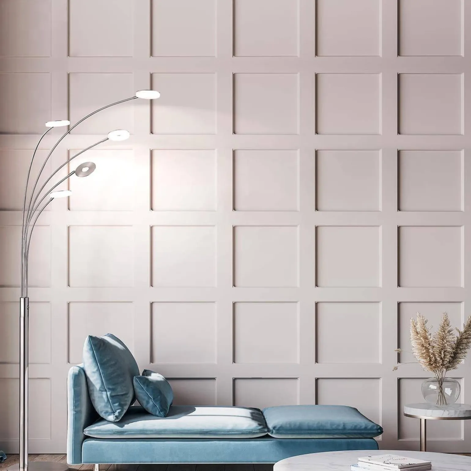 Charakterystyka tej lampy podłogowej wyróżnia się licznymi atutami. Dzięki maksymalnej mocy 7.5 W oraz możliwości zastosowania pięciu źródeł światła, osiąga imponującą wydajność wynoszącą aż 4100 lumenów. Przyjemne, ciepłe światło o temperaturze barwy 2700 K sprawia, że lampa podłogowa LED Dent idealnie sprawdzi się w każdym salonie, wprowadzając miłą i przytulną atmosferę.