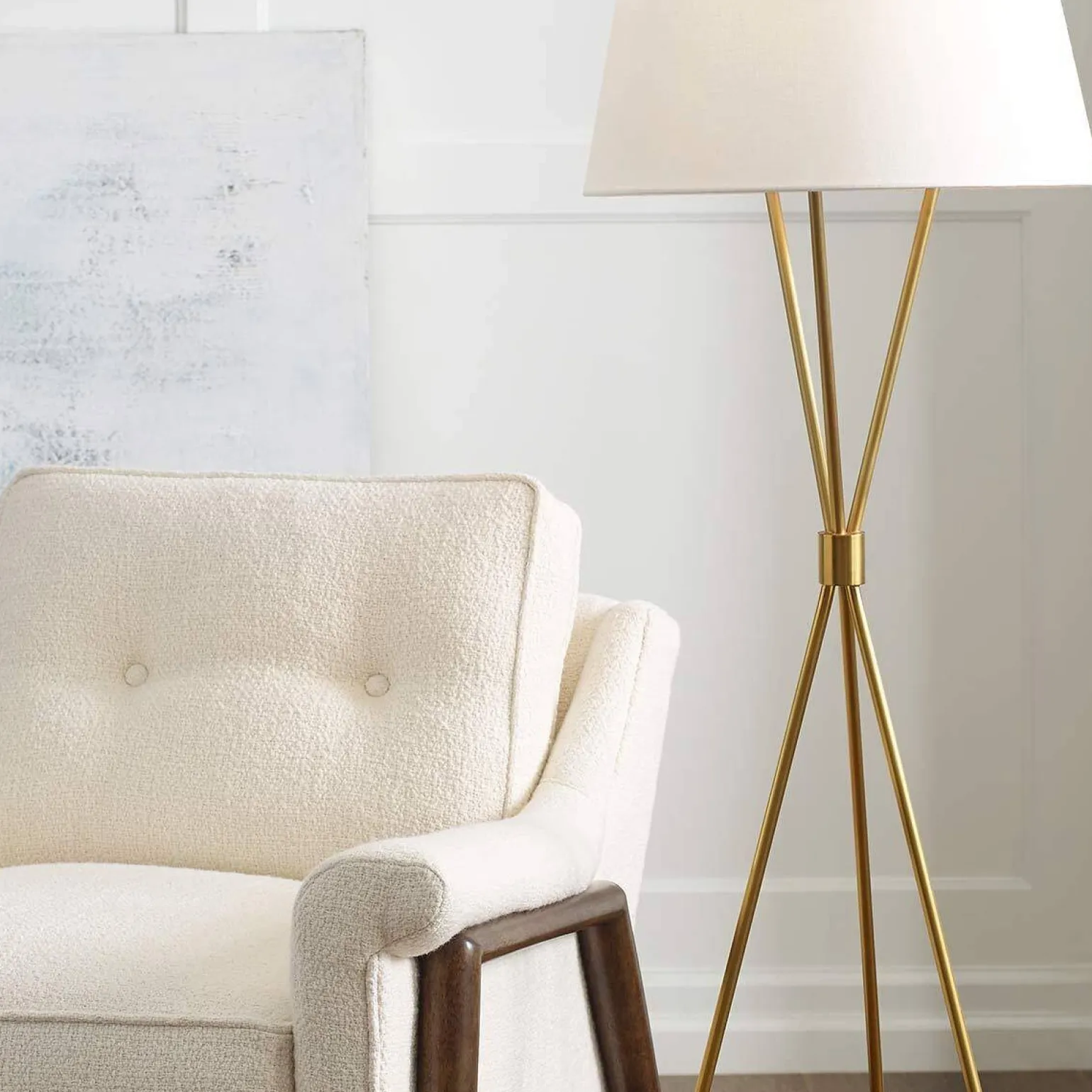 Jednym z najbardziej urokliwych elementów lampy podłogowej Penny jest jej mosiężny kolor. Odcień ten nadaje lampie elegancji i szyku, dzięki czemu idealnie wpisuje się w różnorodne aranżacje wnętrz. Biały klosz zabezpiecza źródło światła i miękko rozprasza je w pomieszczeniu, tworząc przytulną atmosferę. Lampa podłogowa z abażurem doskonale sprawdzi się zarówno w salonie, jak i sypialni, dostarczając światło, które umili każdą chwilę spędzaną w tych przestrzeniach.