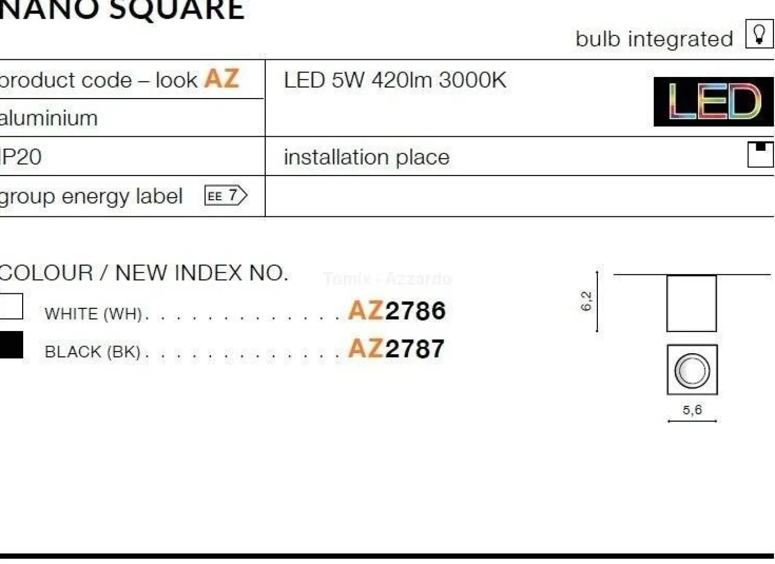 Plafon Azzardo NANO SQUARE z wbudowanym źródłem światła LED posiada trzonek zintegrowany, co gwarantuje jego energooszczędność i długowieczność. Przy napięciu zasilania wynoszącym 230 V, lampa generuje strumień światła 420 lm, co czyni ją efektywnym źródłem oświetlenia. Barwa światła wynosząca 3000 K to ciepła barwa, która wprowadza przytulną atmosferę do każdego pomieszczenia.