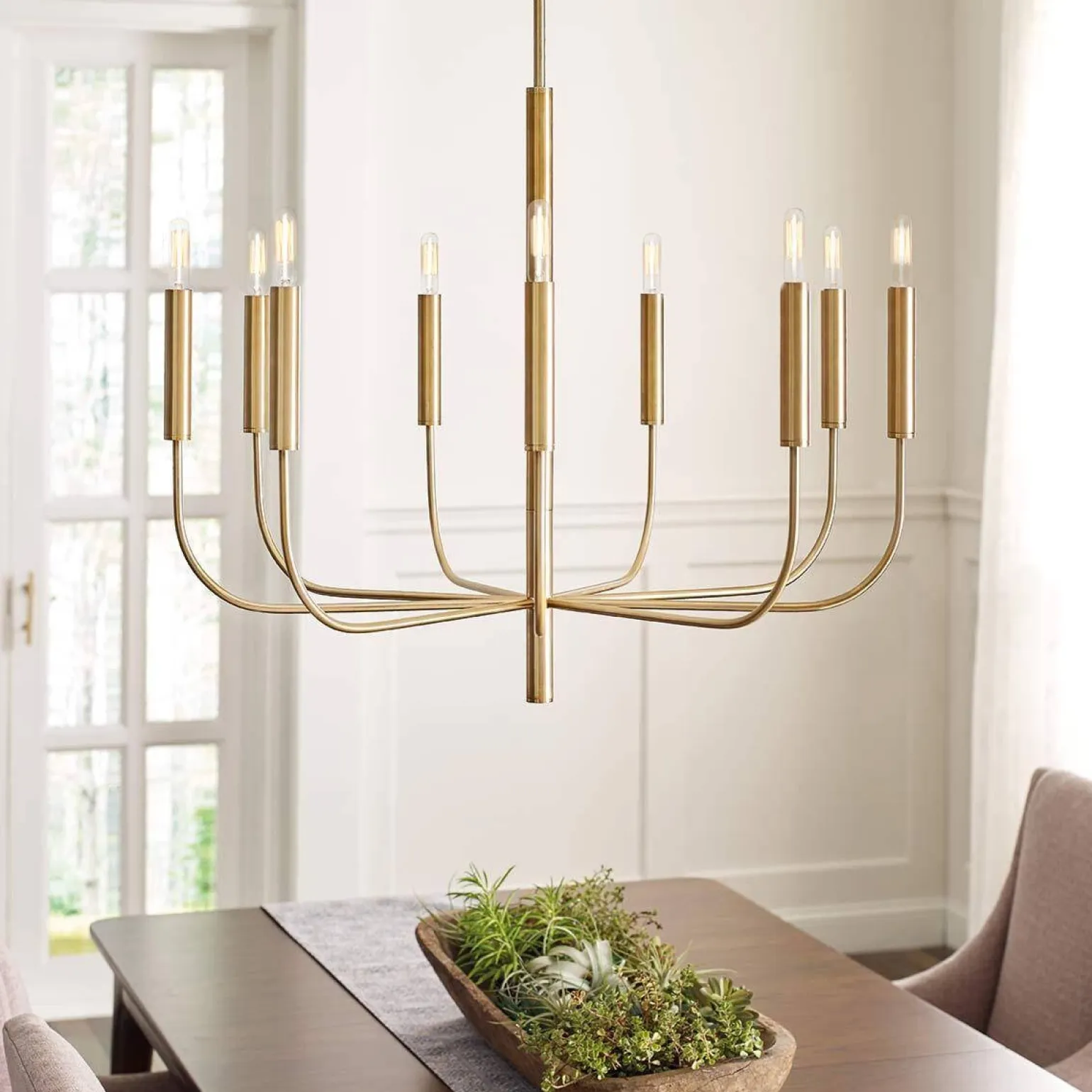 Żyrandol Brianna (FE-BRIANNA9-BB) marki Elstead Lighting to elegancka propozycja, która wprowadza do wnętrza wyjątkowy klimat. Wykonany z wysokiej jakości stali oraz tkaniny, ten żyrandol o mosiężnym wykończeniu doskonale wpisuje się w trendy nowoczesnego designu. Jego stylowe detale przyciągają wzrok i sprawiają, że staje się on nie tylko źródłem światła, ale również efektowną dekoracją, idealną do eleganckich aranżacji.